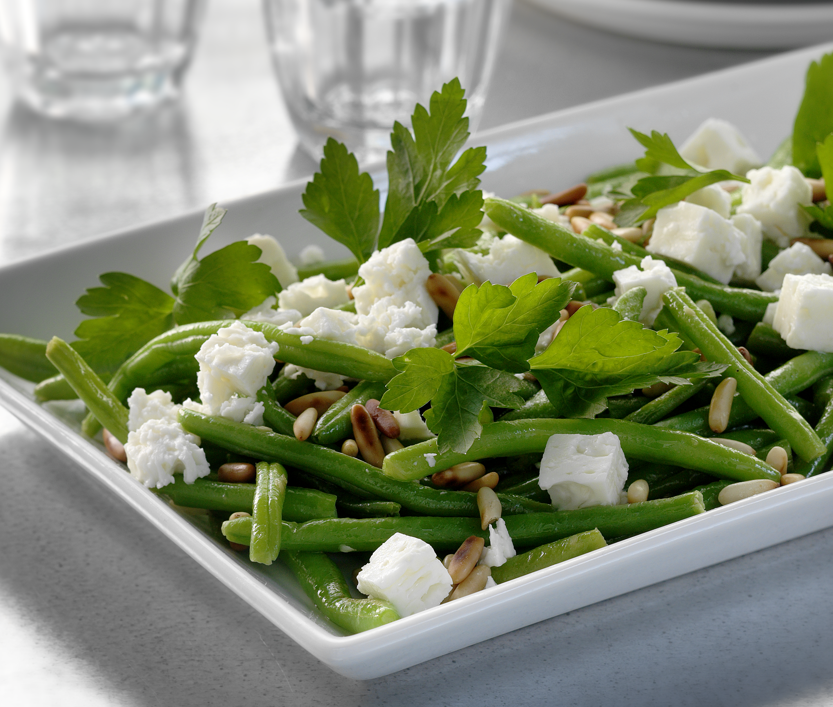 Marinerede bønner med hvidløg og salatost i tern