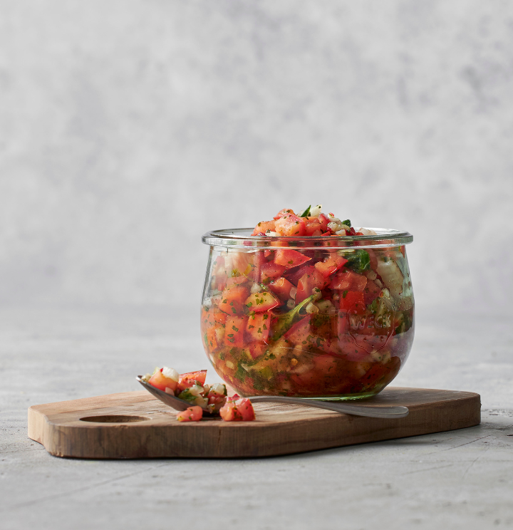 Ingredienser:2 spsk. Ardo Hvidløg i tern2 tsk. Ardo Chili i tern, rød2 spsk. Ardo Forårsløg2 tsk. Ardo Koriander4 stk. friske tomater1 stk. løg1 spsk. olie4 spsk. hvidvinseddike3 tsk. sukkerSalt og peber